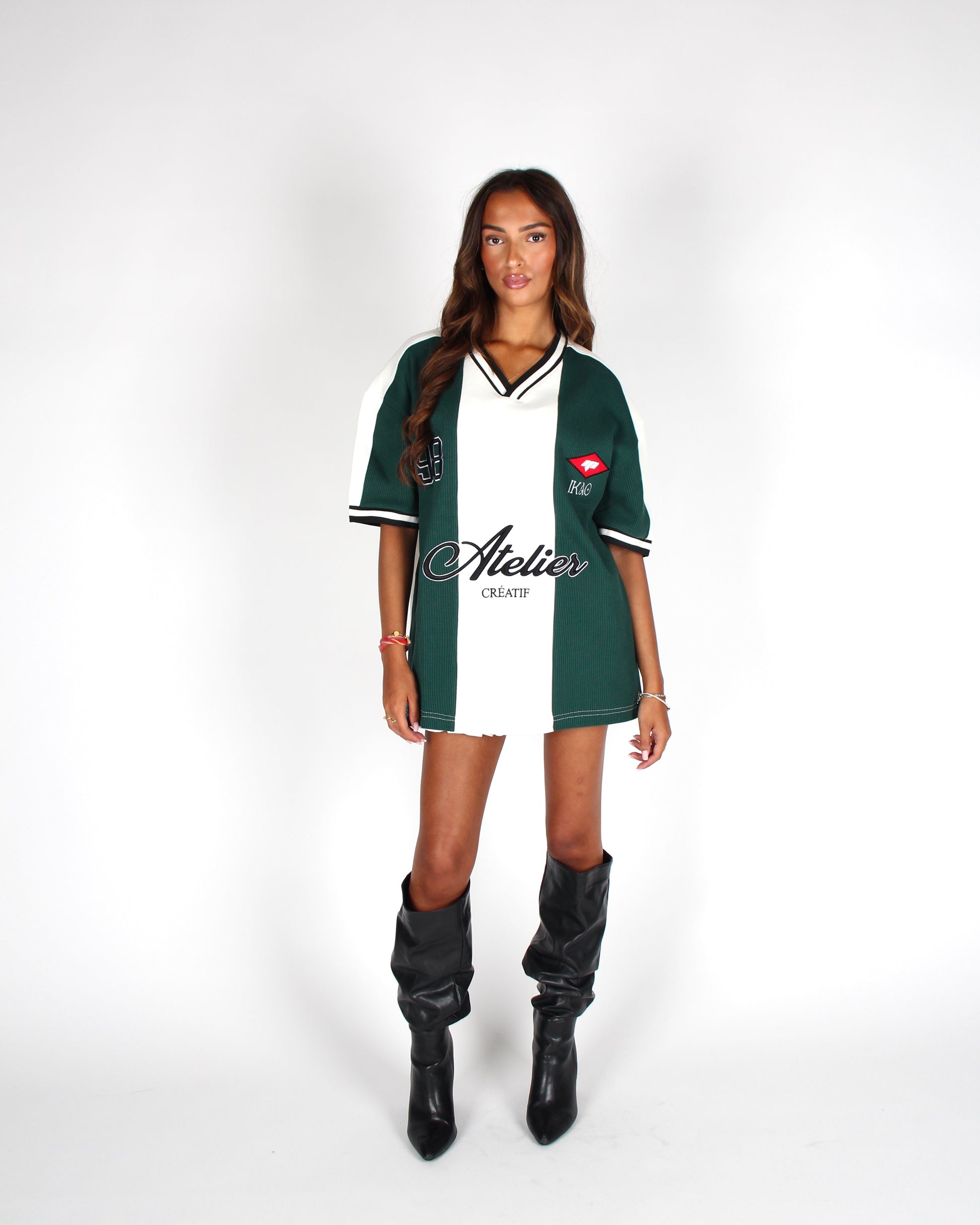 Het ontwerp is voorzien van een verticale kleurverdeling in groen en wit, afgewerkt met contrasterende biezen, een klassieke V-hals en subtiele logo-details. De jersey voelt stevig maar soepel aan – perfect voor dagelijks gebruik of als statement piece in je outfit.